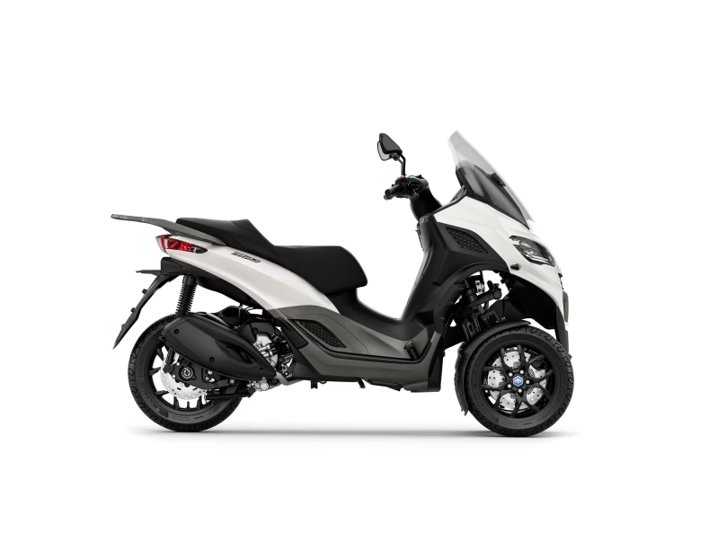 Le Piaggio MP3, accessible avec un permis auto, se distingue par son style audacieux et dynamique, inspiré des détails tendances en matière de design automobile. Les finitions satinées en gris métallisé mettent en valeur les lignes fluides du scooter, tandis que la selle présente des textures et des surpiqûres grises contrastées pour s’harmoniser avec cette teinte. Le pare-brise fumé est équipé de déflecteurs latéraux pour assurer protection et confort, et l’arrière profilé complète l’élégance du design moderne.