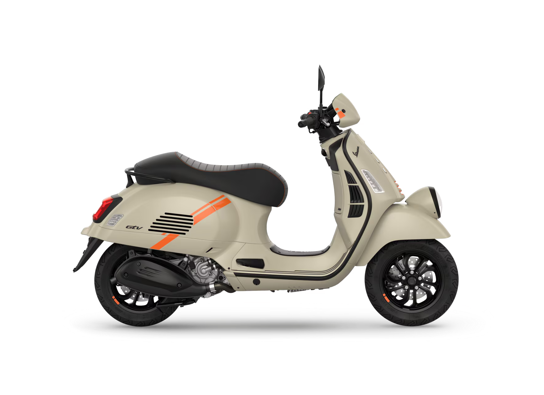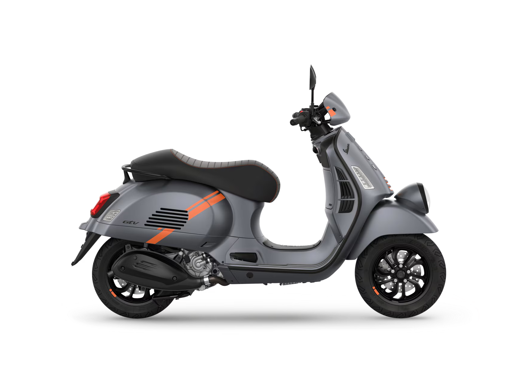 La Vespa Gtv allie l’authenticité du passé à des détails audacieux et contemporains. Les couleurs mates avec des graphismes contrastés accentuent son caractère sportif et moderne, tandis que la selle au look racing monoplace ajoute une touche d’exclusivité. Le phare en position basse et le guidon apparent, en hommage à l’héritage de Vespa, signent le design iconique de la Vespa Gtv, tout comme l’incomparable « cravate » au centre du bouclier.